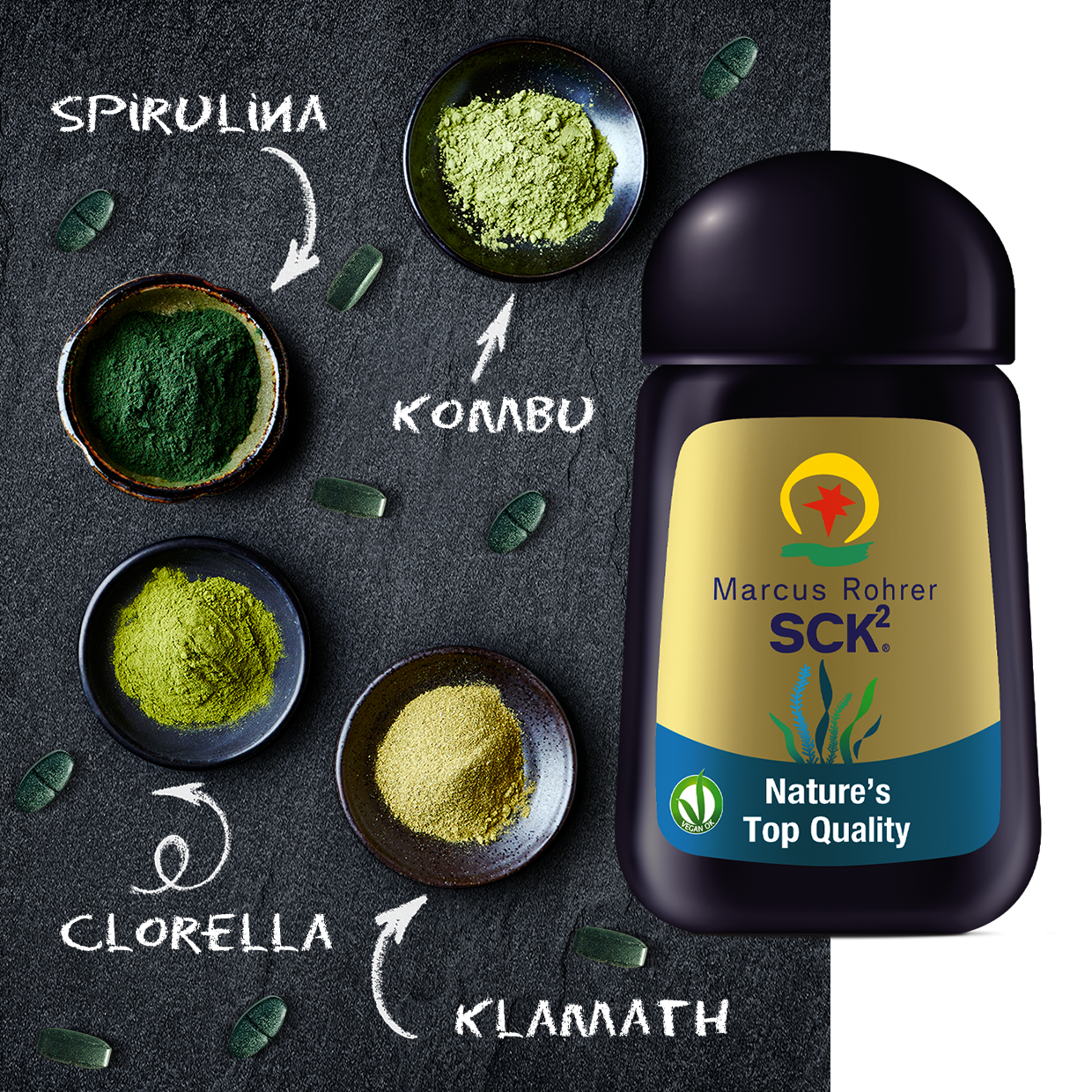 Marcus Rohrer SCK2® è un integratore alimentare a base di Alga Spirulina, Alga Kombu, Alga Klamath e Alga Clorella. Spirulina, da sempre nota per la sua particolare ricchezza in proteine vegetali, ha azione di SOSTEGNO e RICOSTITUENTE, l’Alga Kombu è utile per lo STIMOLO DEL METABOLISMO, l’Alga Klamath contribuisce al normale TONO DELL’UMORE, l’Alga Clorella è un antiossidante utile per le FUNZIONI DEPURATIVE e di DIFESA DELL’ORGANISMO